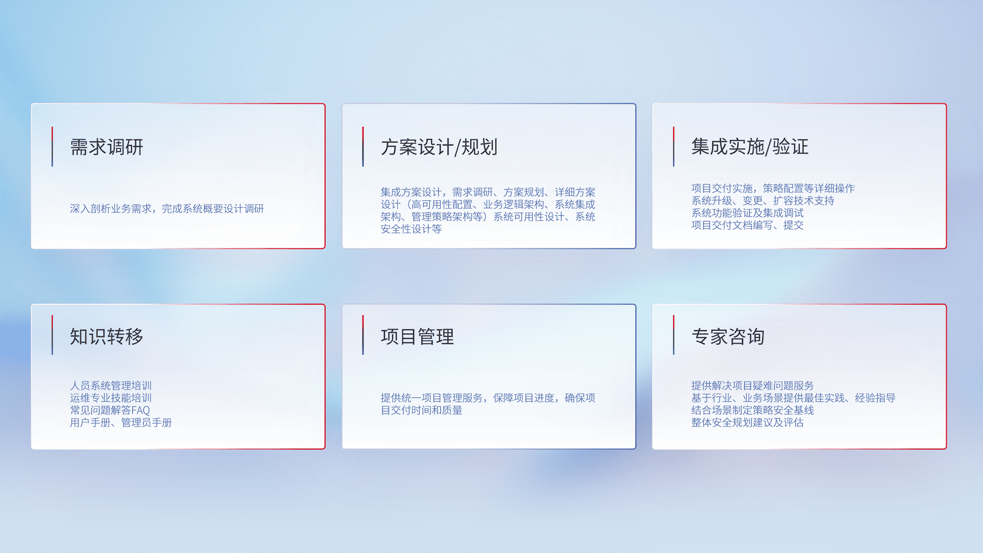 针对客户行业特性,,,将宏观的安全战略和需求,,通过专业的交付服务,,实现项目落地,,为客户提供标准规范的集成交付服务。。。。