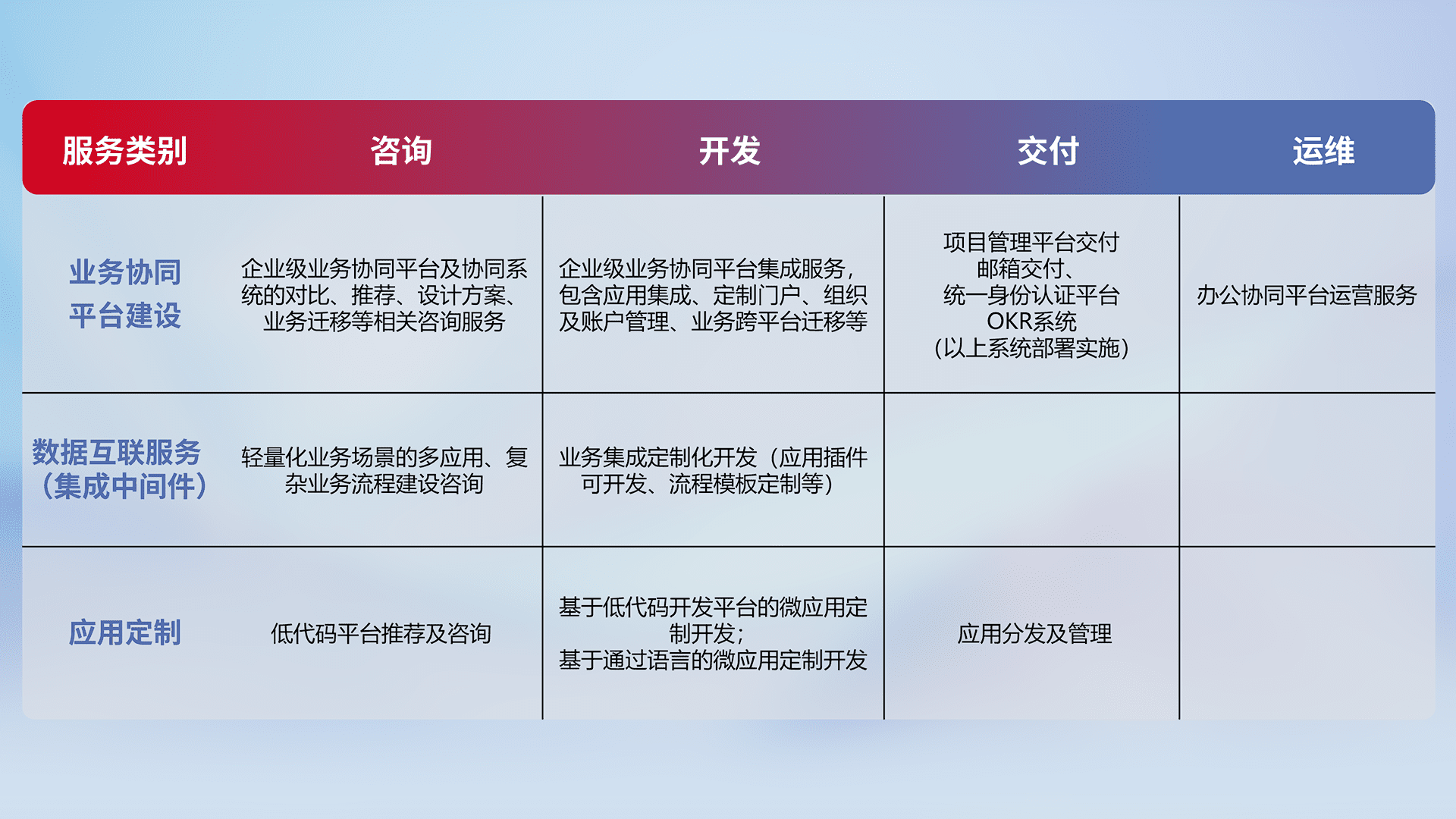 针对钉钉、、、、企微、、IDaas等平台级产品提供产品的规划、、、方案、、、交付、、、定制化开发等服务,,,,实现如统一协同办公、、、智能客户服务、、、、混合会议管理、、、、智能数据查询、、等业务场景,,,实现数字化转型。。。。